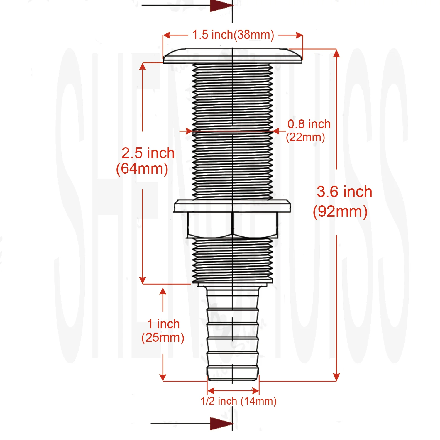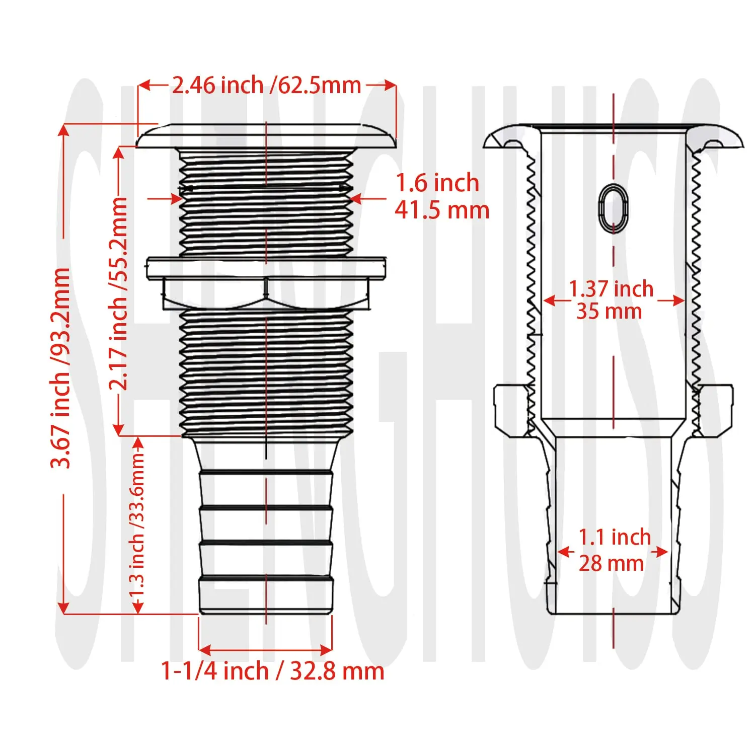 Thru-Hull Fitting Overall Length:3.67 inch(93.2mm), Thread length:2.17 inch(55.2mm), Barb length: 1.3 inch(33.6mm).Outside flange diameter: 2.46 inch(38mm), Barb diameter: 1-1/4 inch (32.8mm), Thread Size: 1.6 inch(41.5mm) .