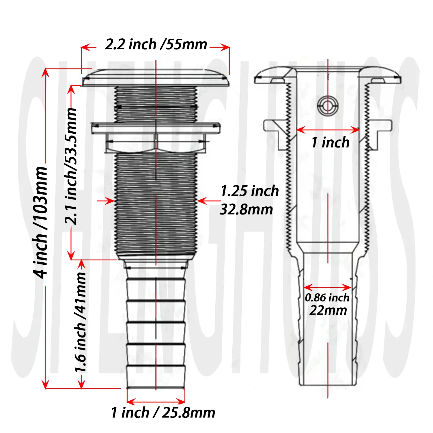 Overall Length: 4 inch(103 mm), Thread length : 2.1 inch(53.5 mm), Barb length: 1.6 inch(41 mm), The Maximum installation thickness of deck is 1.6 inch.Outside flange diameter: 2.2 inch (55 mm), Barb diameter: 1'', Thread Size: 1.25 inch (32.8 mm)