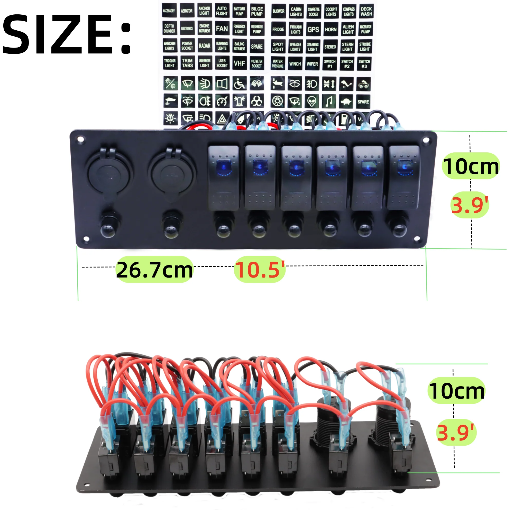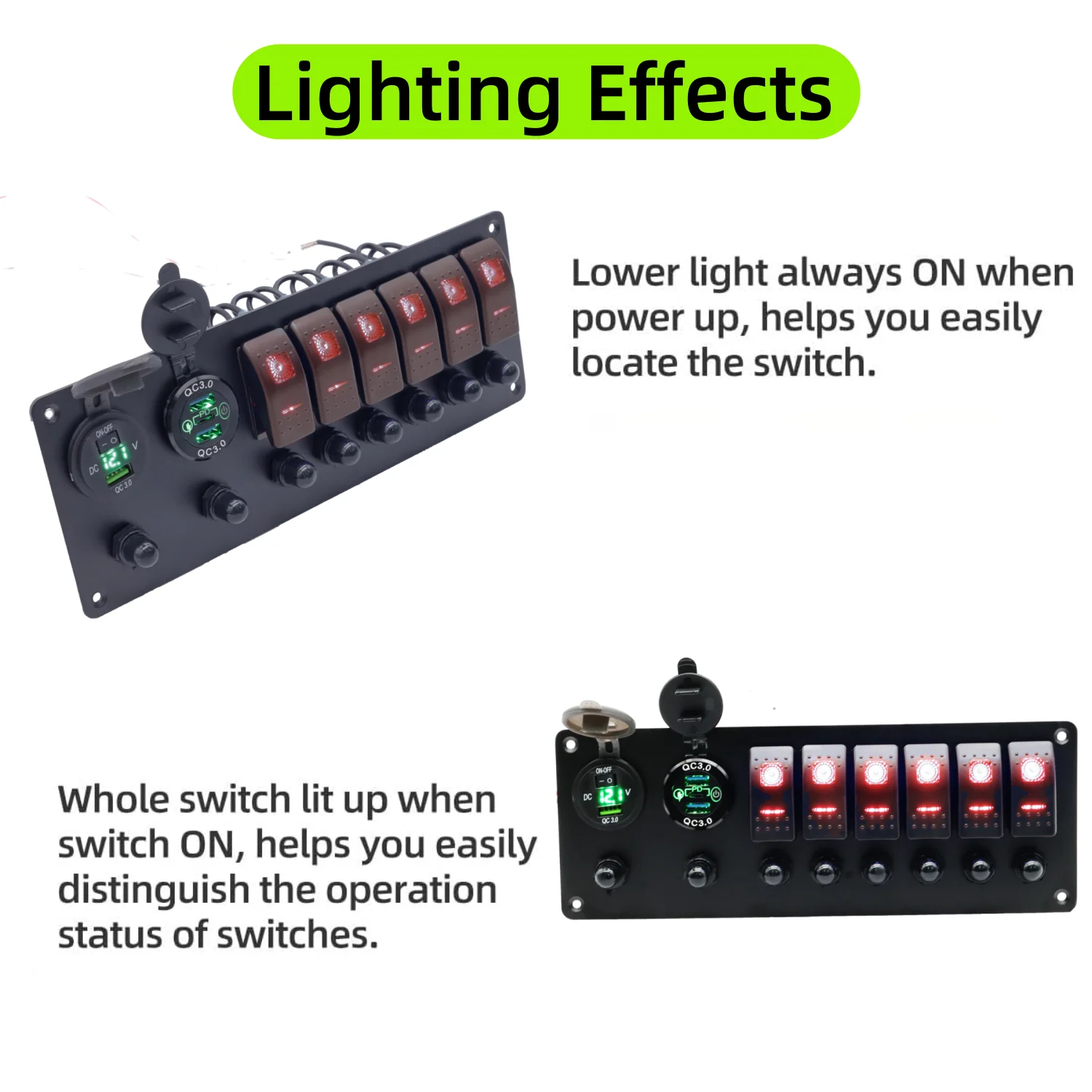 【6 Gang LED Lights Switch】 12V Waterproof Rocker Switch + Rubber cover for USB port, premium aluminum panel make it stronger. Both the socket and usb ports are designed to have rubber sealed caps, making them water-resistant, dust-tight and debris-proof, effectively enhance their service life.