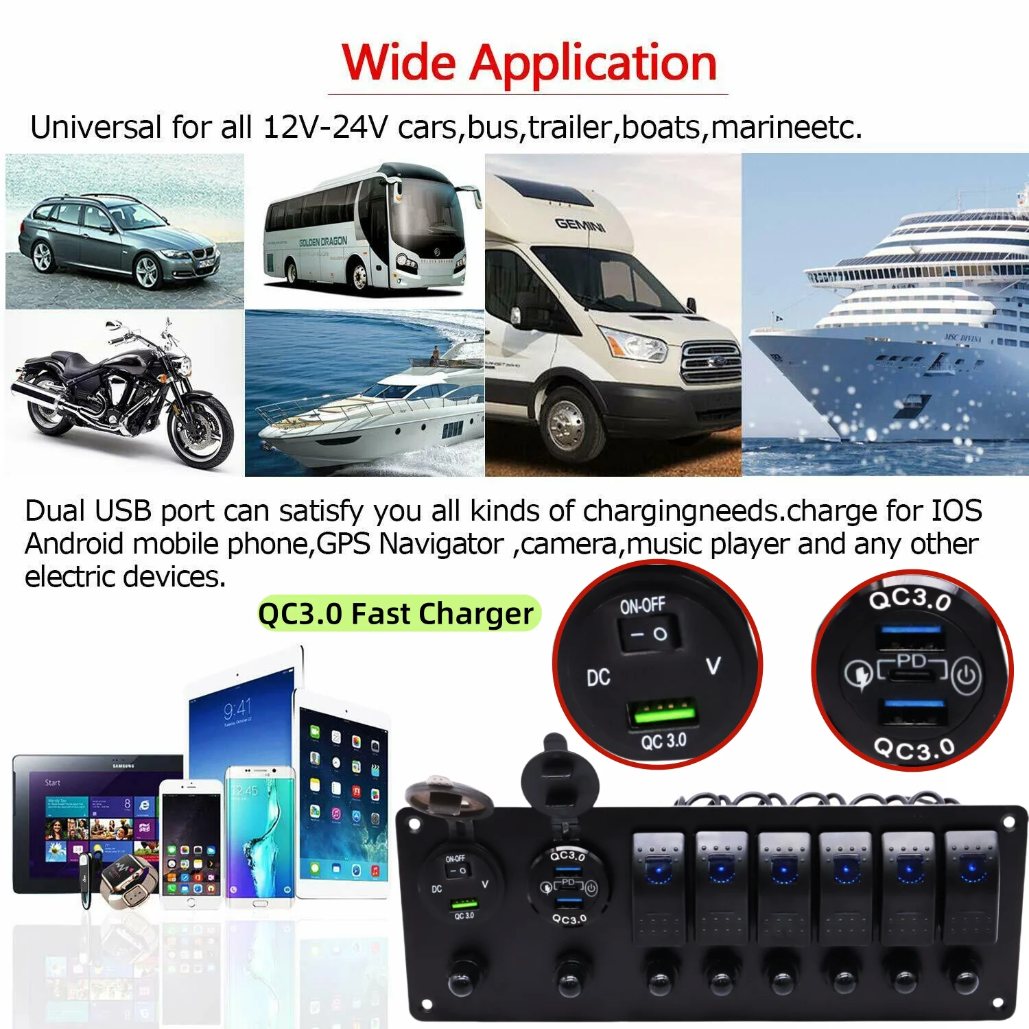 【Reset Circuit Breaker & 4 USB Ports】 12V Rocker Switch Panel Working Voltage DC12V/24V, Output: DC 5V 3.1A, Independant amp per port / Will not decrease amp when two ports are being used LED light indicator built in Waterproof casing will protect the charger from rain or coffee spill Rubber cover should be on to protect the device