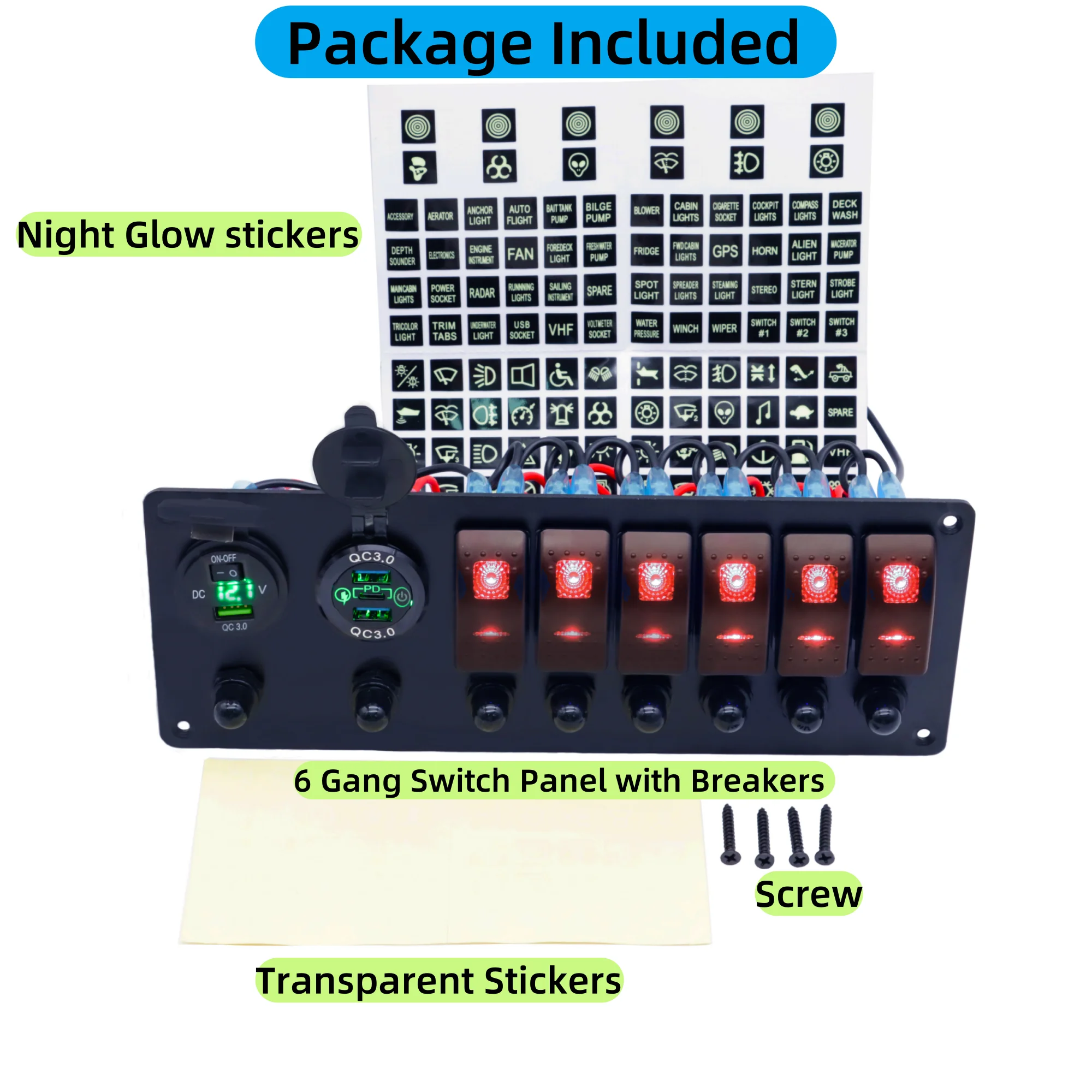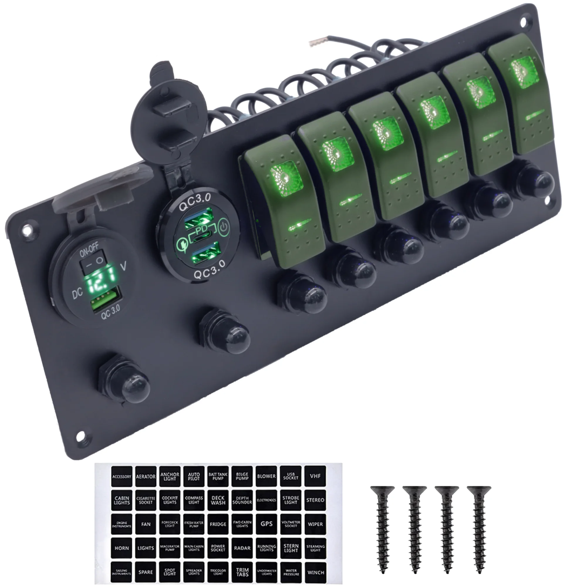 6 Gang Marine Rocker Switch Panel With Circuit Breaker PD USB Socket Voltmeter 12V-24V Car Boat Toggle Switch Panel Waterproof